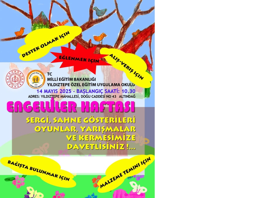 Engelliler Haftası Etkinlikleri kapsamında okulumuzda öğrencilerimizin sunacağı programımız, öğrenci ürünleri sergimiz ve Kermesimiz gerçekleştirilecektir. Bizim için çok önemli olan bu günümüze tüm vatandaşalarımız davetlidir.